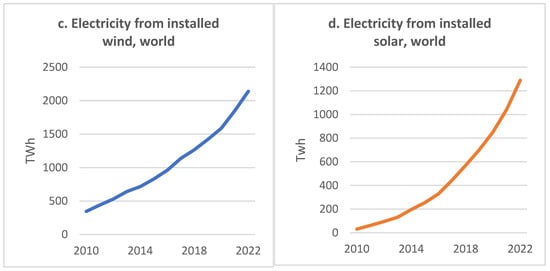 Figure 3a: Electric vehicles purchased per year, million (red); Figure 3b: Heat pumps installed per year, Europe, thousand per year (green); Figure 3c: Electricity generated by installed wind power, TWh per year (blue); Figure 3d: Electricity generated by installed solar power, TWh per year (orange). Data: IEA [112].