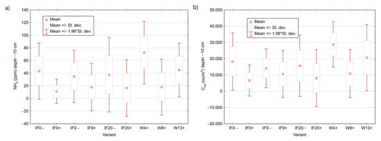 Box-and-whisker plot of ammonia (a) and odour concentration (b) at a depth of 10 cm inside the compost pile. Variants: IF0-: without preparation and addition; IF0+: addition of preparation; IF9-: addition of 9% intermediate fraction; IF9+: addition of 9% intermediate fraction and preparation; IF20-: addition of 20% intermediate fraction; IF20+: addition of 20% intermediate fraction and preparation; W4+: addition of 4-week green waste and preparation; W8+: addition of 8-week green waste and preparation; W13+: addition of 13-week green waste and preparation.
