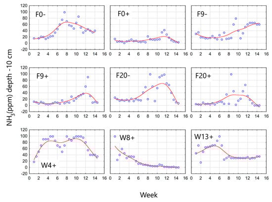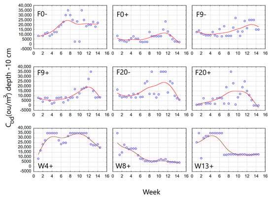 Ammonia and odour emissions by week from the F0+ pile (no IF) with inoculum addition were similar to those from the 9% IF pile with inoculum addition. The most significant difference occurred at weeks 11 and 11.5 (F0+) and at weeks 12 and 12.5 (F9+), when there were increased emissions of ammonia and odorous compounds. In the F0+ pile at that time, the ammonia concentration was 35–42 ppm, and the odour concentration was 15,000–23,500 ou/m3, while in the F9+ pile, respectively, 6–90 ppm and 27,500–35,000 ou/m3. The addition of an IF at 20% intensified the processes in the compost heaps, resulting in increased emissions of ammonia and other odour compounds. After 8.5 weeks of the process, the concentration of ammonia was 99 ppm, and the concentration of odours was 35,000 ou/m3.