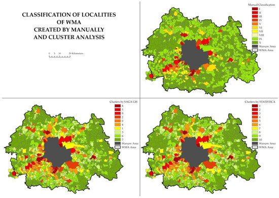 Deeper insight into the phenomenon under study reveals the validity of the selected methodology, i.e., k-means cluster analysis. The results obtained in this way differ significantly from previously published results [29]. When comparing the two methods, however, one could be under the impression that the results obtained with the SAGA GIS 9.3.1 or Statistica 13.3 software are not a reclassification but a complement to the current classification. After all, the range of settlements included in the WMA agglomeration has been extended, not changed or narrowed.