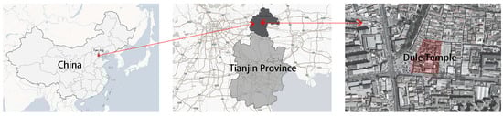 Dule Temple, located at No. 41 Wuding Street in Jizhou District, Tianjin, spans an area of approximately 16,000 square meters (Figure 2). Recognized as one of the first national key cultural relic protection units, it is also designated as a historical building with special protection status by the Tianjin Municipal Government. Additionally, it is situated within a designated historical and cultural block in Tianjin and holds the distinction of being a national AAAA-level scenic spot.