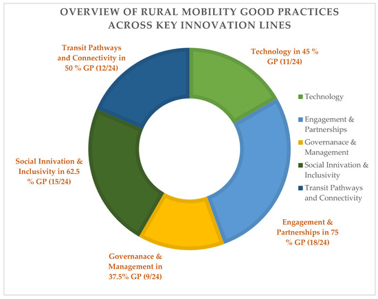 Overview of rural mobility good practices across key categories and innovation lines. Note: The total percentage does not equal 100% because each good practice contributed to innovations in multiple categories.