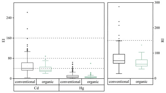 - The PER index of the soil from organic farms in Beijing was below 40, indicating that the soil environment posed a low risk to the quality and safety of agricultural products, crop growth, or soil ecological environments. Compared with conventional agriculture, the EI for As, Hg, Cd, and Pb was also significantly lower in organic agriculture. Moreover, the soil concentrations of As, Hg, Cd, Cr, and Pb were significantly lower than those in conventional agricultural soils. However, moderate Cd risks were observed in 34.38% of the soil samples across all sampling sites, with 1.54% of sites exhibiting a high risk, which suggests Cd accumulation occurred at multiple sampling sites, thereby necessitating continued Cd accumulation risk management in the future.