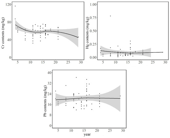 Among the five elements, distinct trends were observed with an increasing number of planting years (Figure 3). Variance analysis revealed that soil Cd and Cr concentrations were significantly influenced by planting years (p < 0.05). Cd concentration initially decreased slightly, followed by a continuous increase, with pronounced variations around the 10th planting year. Cr concentrations initially declined, then showed a slight increase, but ultimately continued to decrease, with marked fluctuations observed around the 13th and 16th planting years.