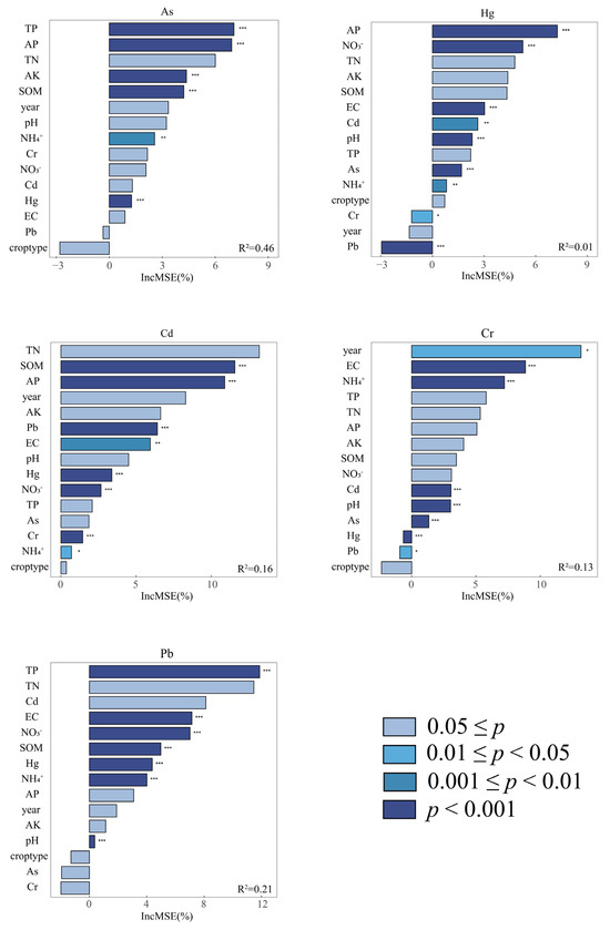 Ranking of variable importance on soil heavy metals in organic agriculture. (The significance of the effect is indicated by * p < 0.05, ** p < 0.01, and *** p < 0.001).