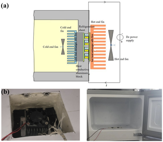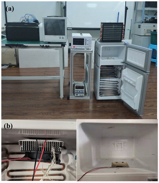 The interaction between the TEC system and the VCR system in Configuration II was further investigated to enhance the overall energy efficiency of the system while maintaining the cooling benefits of each subsystem. The experimental setup for Configuration II is shown in Figure 4a, and the internal structure of the system is depicted in Figure 4b.