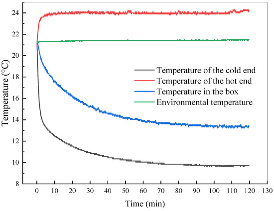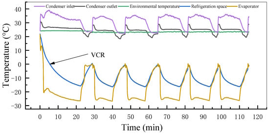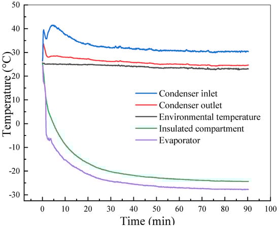 By adjusting the temperature control system to eliminate cyclical starts and stops, the system continuously cools at its rated refrigeration power. The compressor operates consistently at a constant power and speed, maintaining an input power of 58 W. As shown in Figure 7, which represents an experimental setup of the VCR system, the temperature in the refrigeration compartment continues to decrease and then stabilizes. The rate of temperature decrease gradually slows, reaching a minimum of −24.6 °C. The temperature of the evaporator initially drops rapidly in the first 2 min, then the rate of decrease gradually slows, reaching a minimum of −27.9 °C. The inlet and outlet temperatures of the condenser initially rise and then decrease, stabilizing at 30.2 °C and 24.5 °C, respectively. The temperature differences generated compared to the environment within the insulated compartment, at the condenser inlet and outlet, and at the evaporator are 46.1 °C, 8.7 °C, 3 °C, and 49.4 °C, respectively.