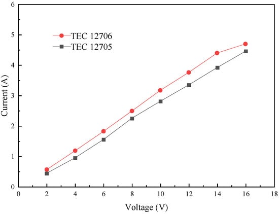 The selection of thermoelectric cooling modules was tested and analyzed, focusing on TEC1-12705 and TEC1-12706, which are common thermoelectric cooling modules in the market. The testing involved placing these thermoelectric cooling modules in an ambient temperature of 21.5 °C with forced air cooling for heat dissipation. As illustrated in Figure 8, the relationship between input voltage and load current for the two types of thermoelectric cooling modules indicates a proportional linear relationship. Both TEC1-12705 and TEC1-12706 exhibit a linear correlation between current and voltage, with an increase in input voltage leading to an increase in input current. A notable observation is that, at the same voltage, the input current flowing through TEC1-12705 is smaller compared to TEC1-12706. The internal resistance of TEC1-12706 is stated as 3.3 Ω, while the internal resistance of TEC1-12705 is 3.6 Ω, both measured at the input rated power of 12 V. This suggests that, under the same conditions, the TEC1-12705 has a higher internal resistance than TEC1-12706. Moreover, at the same input voltage, the input current of TEC1-12705 is less than that of TEC1-12706. This implies that the internal resistance of TEC1-12705 is greater than that of TEC1-12706 when operating at the maximum allowable voltage.