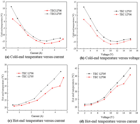 Under the same conditions of heat dissipation, Figure 9 depicts the relationship between the hot- and cold-end temperatures of the thermoelectric cooling module concerning current and voltage. It is observed that the cold-end temperature of TEC1-12706 initially decreases and then increases with the rise in input current and voltage. Notably, the lowest temperature of the cold end of TEC1-12706 is achieved at −16.6 °C when the current is 3.17 A and the voltage is 10 V. Similarly, TEC1-12705 exhibits a similar trend, reaching a minimum cold-end temperature of −14.7 °C at a current of 3.35 A and a voltage of 12 V. Comparing TEC1-12706 and TEC1-12705 under the same input conditions, the cold-end temperature of TEC1-12706 consistently remains lower than that of TEC1-12705. This discrepancy is attributed to factors such as the material’s Seebeck coefficient, temperatures of the hot and cold ends, semiconductor resistance, and input current. Notably, effective heat dissipation at the hot end significantly influences the cooling capacity at the cold end. Improved heat dissipation results in lower temperatures at the cold end, enhancing overall cooling capacity. As input power increases, the hot-end temperature gradually rises, impacting its heat dissipation efficiency. In the early stages, the Boll patch effect dominates, leading to a decrease in the cold-end temperature with increasing input power. However, as input power further increases, the Joule effect heat production surpasses the cooling capacity of the Boll patch effect. Consequently, in the later stages of the test, the cold-end temperature rises with increased input power. In contrast to the cold-end temperature trend, the hot-end temperature increases with rising input current and voltage. For instance, TEC1-12706 exhibits a hot-end temperature of 40.9 °C at 4.7 A and 16 V, while TEC1-12705 registers a higher temperature of 45.3 °C at 4.46 A and 16 V. This consistent pattern indicates that under identical current and voltage conditions, the hot-end temperature of TEC1-12705 remains higher than that of TEC1-12706. Notably, further increasing the input voltage may lead to overheating at the hot end, exceeding the thermoelectric cooling module ’s maximum allowable current and resulting in chip failure. This overheating phenomenon is closely tied to factors such as the material’s Seebeck coefficient, temperatures at the hot and cold ends, semiconductor resistance, and input current. The increase in input current exacerbates the Joule effect, leading to a significant rise in hot-end temperature.