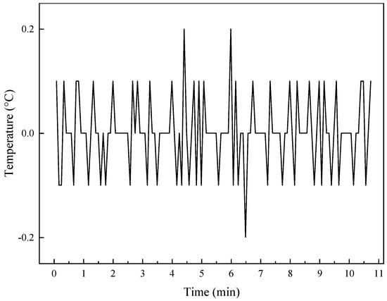 Based on the refrigeration sheet test results, it is evident that the thermoelectric cooling module’s cold-end temperature initially decreases and then increases with the augmentation of input power. Consequently, this section delves into an experimental study examining the relationship between the temperatures of the hot- and cold-end fins in the TEC compartments and the refrigeration compartments over time at three distinct power levels: 10 W, 30 W, and 50 W. In Figure 10, the behavior of TEC1-12706 at an input power of 10 W under ambient conditions of 21.5 °C is depicted. The temperature at each position over time reveals a gradual smoothing trend. The order of temperatures from high to low is as follows: thermoelectric cooling module hot-end-fin temperature, ambient temperature, box temperature, and cold-end-fin temperature. The hot-end-fin temperature experiences a higher warming rate in the first 5 min, stabilizing at approximately 24.1 °C. The cold-end-fin temperature, on the other hand, exhibits a greater initial temperature drop in the first 5 min, followed by a gradual reduction in the rate of decline and eventual stabilization at around 9.7 °C. The temperature inside the box steadily decreases, with the cooling rate gradually diminishing. The lowest temperature reaches 13.3 °C, resulting in a temperature difference of 8.2 °C from the ambient temperature. The test results indicate that the box temperature tends to stabilize with minor fluctuations after initial cooling. In Figure 11, post-stabilization temperature fluctuations within the box are depicted. The temperature fluctuations, as expressed in Equation (1), are observed to be ±0.2 °C or less. Notably, even with a low input power of 10 W, the TEC demonstrates effective refrigeration. This is significant, as typical VCR refrigeration systems usually have a starting power greater than 10 W. The results imply that at lower power inputs, the TEC can achieve noticeable refrigeration effects. Specifically, at 10 W power, it successfully produces an 8.2 °C temperature difference in the 18 L refrigeration compartment compared to the ambient temperature (Equation (7)).