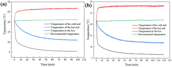 As illustrated in Figure 12, showcasing the temperature-versus-time curves for the thermoelectric cooling module at 30 W and 50 W power, the hot- and cold-end-fin temperatures, as well as the refrigeration compartment temperatures, exhibit a consistent pattern as observed at 10 W power. Specifically, the hot-end-fin temperatures stabilize at 26.4 °C and 28.1 °C, the cold-end-fin temperatures reach equilibrium at 5.5 °C and 6.7 °C, and the refrigeration compartment temperatures maintain stability at 11.1 °C and 11.8 °C. Additionally, the temperature difference between the cooling compartment and ambient temperature is noted as 10.4 °C and 9.7 °C. The experimental results indicate that with an increase in power, the internal temperature of the box does not consistently decrease. A comparison between the 50 W and 30 W thermoelectric cooling module reveals a temperature difference of 0.7 °C in the refrigeration compartment compared to ambient temperature, indicating a smaller refrigeration capacity for the 50 W thermoelectric cooling module.