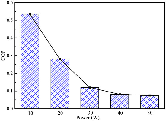 The analysis presented in Figure 13, comparing the equilibrium temperatures of the TEC compartment thermoelectric cooling module at different power levels, reveals important trends in the TEC system. Notably, the hot-end-fin temperature increases with the rise in input power, while the cold-end-fin temperature initially decreases and then increases with the increase in input power. This behavior is attributed to the thermoelectric cooling module, where the lower temperature of the cold end influences the refrigeration compartment temperature. Consequently, the refrigeration compartment follows a similar pattern of change as the thermoelectric cooling module cold-end fins. Figure 14 illustrates the COP in relation to the change in input power. It is evident that as the power of the thermoelectric cooling module increases, the COP gradually decreases. At an input power of 10 W, the COP reaches 0.53, the cooling capacity is 3.6 W, and the COP is 0.12 when the input power is 30 W. But when the input power surpasses 50 W, the COP drops to less than 0.1. The observed decrease in COP with increasing input power signifies a reduction in refrigeration energy efficiency. This diminishing efficiency is a significant challenge and a primary obstacle to the widespread commercialization of TEC technology. The findings emphasize the need for further research and development to address efficiency concerns and enhance the feasibility of TEC systems for broader applications.