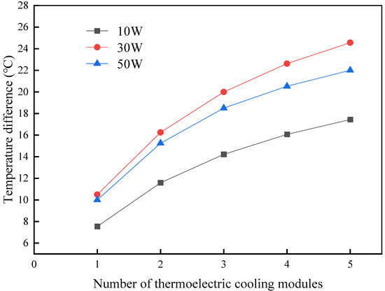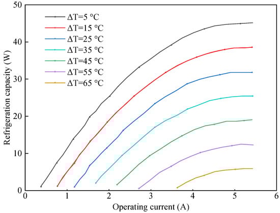 As shown in Figure 22, under the condition of the same input current, with the decrease of the temperature of the hot and cold ends, its cooling capacity gradually increases, and the maximum cooling capacity can reach 45 W at the input current of 5 A and the temperature difference between the hot and cold ends of 5 °C.