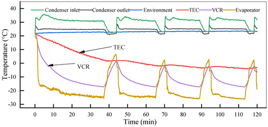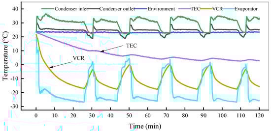The input power of the TEC system under Configuration II is increased from 2 W to 10 W, as shown in Figure 17. As the input power to the TEC system increases, the temperature within the TEC compartment decreases further, reaching a temperature difference of 25.2 °C. Consequently, the time required for the VCR system to cool from ambient temperature to its minimum value extends to 37 min, with a corresponding increase in the cycle time to 28 min. This increase in cooling time can be attributed to several factors. In the input power range of 0–10 W, the TEC cooling capacity improves as the input power increases. Specifically, the poloidal effect of the thermoelectric cooling module intensifies with increasing input power, which results in a further reduction in the compartment temperature. However, the increased input power also amplifies the Joule heating effect within the thermoelectric cooling module, raising the temperature at the hot end. This increased heat at the hot end is absorbed by the evaporator, leading to a longer time for the VCR system to reach its minimum temperature.