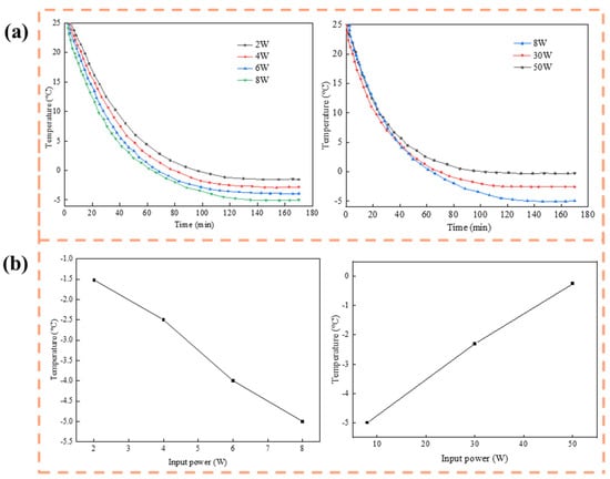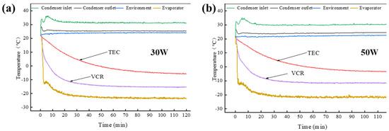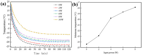 Increasing the input power of the TEC system has two effects. First, an increase in TEC system input power initially increases and then decreases the cooling capacity of the TEC system. Second, the temperature in the VCR compartment rises due to the absorption of heat generated by the TEC compartment. Therefore, it is necessary to determine the optimal input power range for TEC system, where the TEC compartment should achieve significant cooling while minimally affecting the VCR compartment. In the experiment, the VCR system was set to operate continuously at a constant power, with varying input power to the TEC system. Figure 20a shows the effect of different TEC system input powers on the VCR compartment’s cooling, with thermoelectric cooling module input power gradually increasing from 2 W to 30 W. Test results indicate that as the input power of the thermoelectric cooling module increases, the lowest achievable temperature in the VCR compartment rises, and the cooling rate gradually slows down. As shown in Figure 20b, the lowest temperature in the VCR compartment with the thermoelectric cooling module at 0 W–8 W input power increases from −24.4 °C to −17.8 °C.