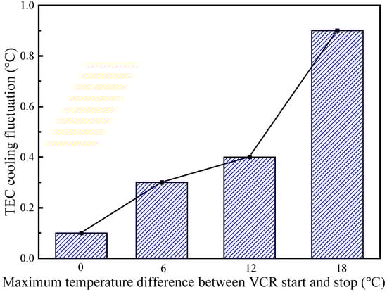 Currently, commercial refrigerators equipped with fixed-speed compressors in VCR systems exhibit internal temperature fluctuations of about 6 °C. Therefore, this section investigates the impact of VCR temperature fluctuations on the TEC system under Configuration II. Gradually reducing the temperature fluctuations inside the VCR compartment, the temperature was maintained at ranges from −18 to 0 °C, from −18 to −6 °C, from −18 to −12 °C, and under no fluctuation conditions. As shown in Figure 19, the test results indicate that with the reduction in temperature fluctuations of the VCR system, the temperature fluctuations in the TEC cooling compartment gradually decrease. Even without any control algorithm involved, when paired with the current commercial VCR systems having 6 °C temperature fluctuations, the temperature fluctuation in the cooling compartment remains relatively small, maintained within ±0.3 °C.