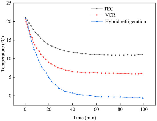 The container had a capacity of 18 L. Figure 23 illustrates the temperature changes over time within the cooling compartment under three different conditions: when the TEC system is operating alone, when the VCR system is functioning independently, and when both systems are cooling simultaneously. The temperatures for these respective conditions reached 11.1 °C, 5.9 °C, and −0.2 °C. It was also observed that the TEC system alone took 40 min to stabilize at its lowest temperature of 11.1 °C, while the VCR system alone reached 11.1 °C in 13 min, and the hybrid systems took 9.6 min to reach the same temperature. In addition, for the hybrid system in configuration III, the VCR system has a cooling capacity of 139 W, the TEC system has a cooling capacity of 3.4 W, and the COP value is 1.55. This demonstrates that under Configuration III, simultaneous cooling allows for the combined cooling capacity of both systems, significantly enhancing the cooling effect, reducing the time taken to reach the same temperature, and further increasing the temperature difference inside the container. Under fixed cooling capabilities of the VCR system, the greater the cooling capacity of the thermoelectric cooling module, the larger the overall cooling capacity of the hybrid system.