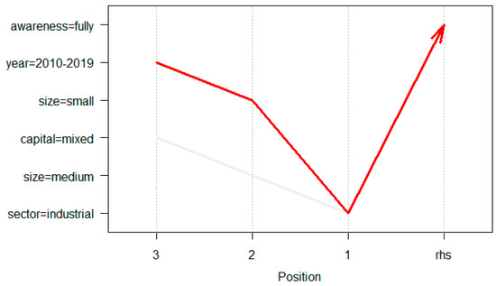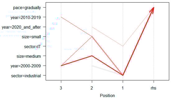 - Rule 6: If sector = industrial, size = small, year = 2010–2019, then the probability of quick/gradual pace of implementation of Industry 5.0 is 88.89% (lift = 1.69).