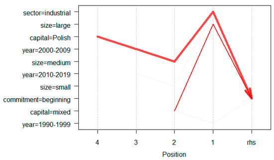 - Rule 2: If sector = industrial, size = medium, year = 2000–2009, capital = Polish, then the probability of active/starting commitment is 69.23% (lift = 1.52).