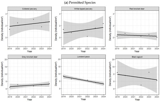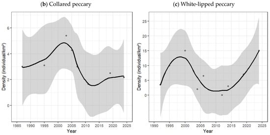Population time-series graphs with dots showing the annual densities, and the lines showing mean trends. The population trends of mammalian densities (individual/km2) were of (a) collared peccary (Pecari tajacu), white-lipped peccary (Tayassu pecari), lowland paca (Cuniculus paca), black agouti (Dasyprocta fuliginosa), red brocket deer (Mazama americana) and grey brocket deer (Mazama nemorivaga) from 2019 to 2024, (b) collared peccary from 1985 to 2024 and, (c) white-lipped peccary from 1992 to 2024, after the implementation of the management plan in 1991 with the grey shaded area representing a 95% confidence interval (CI).