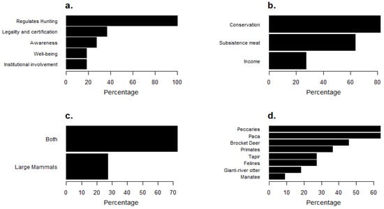 Thematic analysis used NVivo to understand hunters, perspectives on the management plan. All the participant hunters said that the management plan is important to them. Figure 3 (All figures were created using RStudio, however analysis was done on NVivo) shows the percentage response to what the hunters value in the management plan. (a) All of the hunters said the management plan was important to them because it regulates hunting. (b) Hunters said that the management plan is working for them, firstly for the conservation value, secondly for the subsistence meat value, and thirdly for the income. (c) Hunters said that both large and small mammals were favored by the management plan. (d) Hunters said that peccaries were the most important mammals for the management plan followed by the paca and brocket deer.