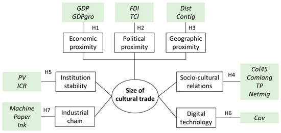 The multidimensional proximity theory in economic geography holds that the interaction between actors depends on the interaction between acting subjects, such as geography, cognition, institutional proximity, etc. [27,28]. However, for cultural trade, it is not clear which indicators can be used to measure cognitive proximity. Like trade in all products, the printed material trade is affected by the economy, geography, and other factors. Beyond that, the printed material trade involves geopolitics, cultural ties, and technological diffusion, which have not been revealed in previous studies. Based on this, this study takes the factors of the economy, geography, geopolitics, cultural ties, and technology diffusion into account together to construct an analytical framework for analyzing the evolution of the global cultural printed material trade network focusing on the seven dimensions of economy, politics, geography, culture, institution, technology, and production chain, which are substantiated one by one, the size of cultural trade is defined as the aggregate of the imports and exports of cultural printed materials within a country (region) (Figure 1).