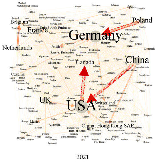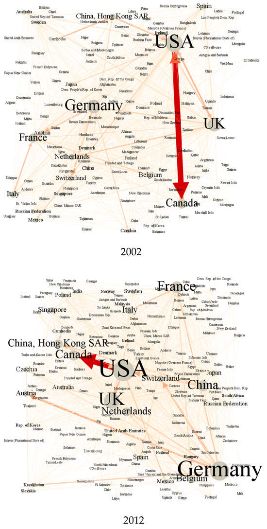 In this study, trade flows between countries with effective trade (defined as trade volumes of $1 million or more) were selected to construct a network. In 2002, the trade network encompassed 160 countries and 1139 trade flows, representing approximately 97% of world trade; in 2012, this trade network expanded to include 188 countries and 1751 trade flows, accounting for about 95% of world trade; in 2021, it involved 174 countries and 1593 trade flows, reflecting over 98% of world trade; all the three time nodes effectively illustrate the global trade of cultural printed materials. The size of nodes indicates their weighted centrality, and the lines among nodes reflect the trade volumes. From 2002 to 2021, the global cultural printed material trade network has become gradually dense, with a gradual rise in network density. The connections among node countries (regions) in the network are gradually increasing. Throughout these three time nodes, the export trade flow between the United States and Canada has consistently ranked first, important trade flows have increased over time, such as China–the United States, and Poland–Germany in 2021 (Figure 2). The United States and Germany have maintained their position as the world’s largest exporters of cultural printed materials, significantly outpacing China and Poland. Within the global trade flow of all cultural printed materials, the exports of the United States to Canada, Poland to Germany, and the exports of China to the United States are the most important cultural printed material trade flows in the world. The United States, Germany, and China play pivotal roles in the supply of cultural printed materials. This is not only because of their substantial production capacities, which command a significant share of the global market, but also because of their strong commitment to the development of the cultural industry.