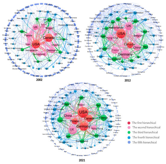 The global cultural printed material trade network exhibits a clear core–periphery structure: the United States–Canada has long occupied the core of this network, while Germany–Poland has emerged as a new core (Figure 3). The United States has maintained a stable core position within the network. From a regional point of view, Europe and the United States have dominated the global cultural printed material trade for an extended period, with the core status of the Asian region gradually improving. In 2002, the United States and Canada were classified as the first tier of the network and dominated the overall trade. The second tier comprised eight countries: the United Kingdom, Germany, France, Norway, Spain, Ireland, Belgium, Italy, the Czech Republic, Switzerland, and Austria. The third tier included 11 countries (regions), such as China and Hong Kong. The fourth tier encompassed 28 countries, including Russia and Sweden. The fifth tier consisted of 112 countries, including Guatemala and Slovenia. In 2012, the core positions of the United States and Canada remained robust, maintaining their status in the first tier of network. Germany, the United Kingdom, France, and several other nations were classified as sub-core countries in the second tier. China and Hong Kong advanced from semi-peripheral countries (regions) in the third tier in 2002 to sub-core countries in the second tier. Switzerland, Belgium, Italy, Spain, Singapore, and so on were in the third tier. By 2021, the network’s “two-pair core” structure had matured, with the United States–Canada and Germany–Poland forming the first tier as core countries. China, Hong Kong, the United Kingdom, and Mexico were recognized as the sub-core countries (regions) in the second tier (Figure 3).