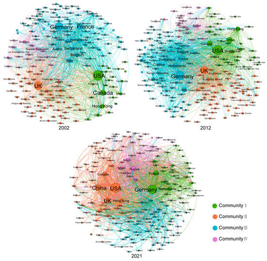 In 2002, the modularity of the trade network was 0.363, which was divided into four network communities. Community I, led by the United States, has a total of 22 member countries (regions). It mainly consisted of the United States, Canada, Hong Kong (China), and some other nodes. Community II was the second largest society spearheaded by the United Kingdom, comprising 53 member states, accounting for 31.36%. Within the community, there were Asian countries such as Malaysia, Japan, and Singapore, alongside other countries like South Africa, Nigeria, and Australia. Community III was the largest community led by Germany, with 77 member states, accounting for 45.56% of the entire network. Within the community, most of the members were European countries, including France, The Netherlands, Belgium, Switzerland, Spain, and Austria as significant members. In 2012, the status of the three major communities was consolidated and continued to absorb and integrate. The modularity was 0.366, maintaining the division into four network communities. Community III, led by Germany, remained the largest with 75 member states, accounting for 39.68%. Community II, under the leadership of the United Kingdom, retained its position as the second largest community, comprising 58 member states, accounting for 30.69% of the entire network, including five new countries. Community I, led by the United States, expanded to include 36 member states, accounting for 19.05%. Based on nodes such as the United States, Canada, and Hong Kong (China), it also newly absorbed Asian countries such as Singapore, South Korea, and Thailand in 2012. In 2021, the community continued to integrate, forming two factions led by the United States and Germany. The modularity reached 0.375, with the network divided into four network communities. Throughout the process of evolution, community II continuously integrated with other communities, forming a community with the United States, China, and the United Kingdom as important nodes. In community I, the significance of Poland and The Netherlands increased, leading to the formation of a new community centered around Germany, Poland, and The Netherlands. France, Belgium, and Spain separated from the original community (Community III in 2012) and gradually transitioned into a new community (Figure 4).