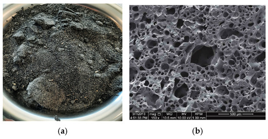 Overview photo of the combustion slag used in this study (a). SEM image of its structure at ~500 μm (b).