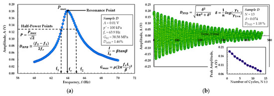 The damping results in this case are obtained here by the free-vibration decay (FVD), according to [34], and half-power bandwidth (HPB) (also known as steady-state vibration) methods (Figure 4a and Figure 4b, respectively). The D-ratio calculated based on the free-vibration curve shape measured by the accelerometer installed on the drive plate is derived from the standard RC damping test. Torsion is applied to the sample for the user-defined time (2 s). The excitation is then turned off, and the accelerometer measures the decaying free oscillations [46]. The free vibration decay damping ratio (DFVD) is determined from the slope of the peak shear strain amplitude versus the number of cycles plot obtained from the free vibration data (Figure 4b). The least squares analysis calculates the DFVD-ratio and the fitted correlation coefficient. Based on the goodness of fit (i.e., correlation coefficient value) for the selected peak and trough sensitivity data, the damping ratio is derived for the specified number of cycles [47]. This study defines the representative number of cycles for each test used to calculate D when FVD is applied.