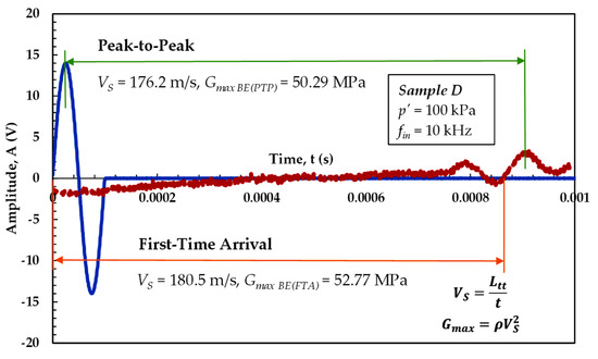 Determination of the maximum shear modulus from the BE tests (time domain results, PTP, and FTA techniques). Red color—transmitted wave, dark blue color—received wave.