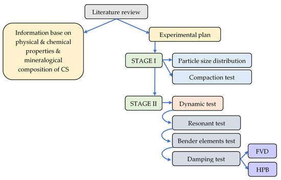 An innovative aspect of this article is the evaluation of small-strain stiffness, and vibration-damping parameters propagated in the ground environment built with alternative materials, here, CS. Concerning road construction, the following main characteristics are required: mineral composition, grain shape, fragmentation, durability, environmental harm, the content of fines (below 0.063 mm), grading curves with grading limits, compactability, maximum grain size, and frost susceptibility. With regard to possible road subsoil vibrations, the above list should be enriched with dynamic and/or cyclic characteristics. Since CS is to be treated as a replacement or alternative to the natural soil material (aggregate), for road construction where dynamic and/or cyclic loads can be expected, its dynamic and cyclic properties must be investigated (similar to what is conducted for natural soil).