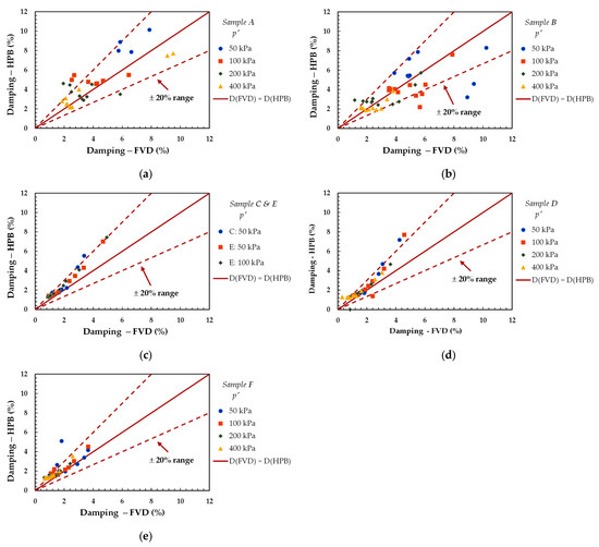 Comparison of damping characteristics between FVD and HPB obtained at small to medium strains: (a) for sample A; (b) for sample B; (c) for sample C and E; (d) for sample D; (e) for sample F.