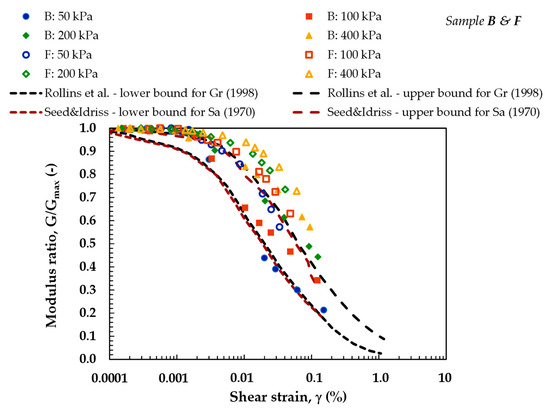 In this Section, the results obtained for two samples, B and F, are presented and compared with each other to investigate the influence of mean effective stress and relative density on the dynamic properties of Siekierki combustion slag. The specimens were prepared in different states as medium (Dr ≈ 60%) and dense (Dr ≈ 80%), and the RC tests were performed at four different mean effective stresses (p’ = 50/100/200/400 kPa).