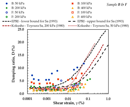 The damping ratios for samples B and F as a function of shear strain are plotted in Figure 11. Again, similar to Figure 10, full symbols refer to sample B, medium dense, whereas blank symbols refer to sample F, well compacted. To plot Figure 11, the HPB method was adopted in small-strain damping measurements (γ < 10−5), and the FVD technique in medium-strain damping measurements (10−5 < γ < 10−3). In general, the D-ratio values for CS specimens increase slowly until the shear strain reaches the value of ~0.0001. Then, an exponential growth in damping is observed when the shear strain is greater than ~0.0001. For the same specimen, it is clear that the damping values under low pressure are higher than those under high pressure (variance in damping between the applied pressures ΔD ≈ 1.26–3.0%, and ΔD ≈ 0.28–0.72%, for samples B and F, respectively). As with the stiffness characteristics, the trend described here is true for all test specimens. The increase in pressure contributes to better packing of the grains, which in turn leads to faster wave propagation in the subsoil and a reduction in wave damping [66]. The results from Figure 11 reveal that the influence of p’ on the damping properties of the Siekierki combustion slug is more prominent at the medium-strain level. Similar findings were also documented in Kokusho [68], Ni [71], Stokoe et al. [72], and Mog and Anbazhagan [73]. It has also been shown that the effect of p’ on damping in the low-strain range is rather small.