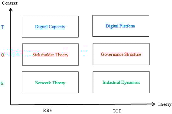 Another perspective to look at the themes of both RBV and TCT is the Technology-Organization-Environment (TOE) framework, originally designed for technology adoption [44]. The three dimensions of TOE are “contexts” that emphasize the multiple, interconnected settings that shape an organization’s decision-making and behavior [6]. Both digital capability and digital platforms are in the technology (T) dimension, emphasizing the prominence of the digital economy in open innovation. Stakeholder theory and governance structure form the organization (O) dimension, arguing for the importance of organizational resources and capabilities. Network theory and industrial dynamics underscore the environmental (E) dimension, stressing the factors from outside.