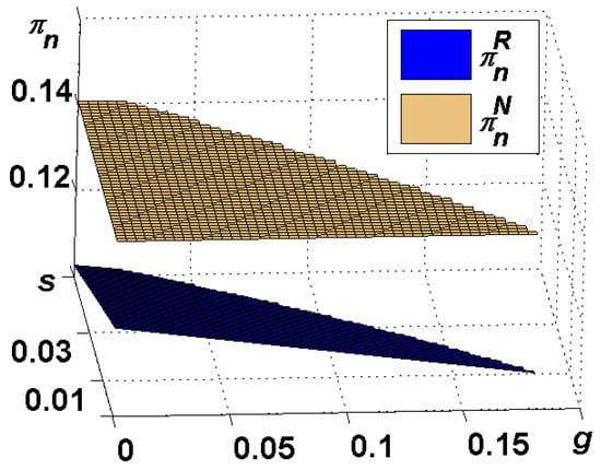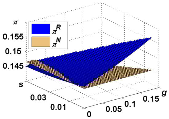 Recall that, as Proposition 3 shows, always holds true due to the cannibalization problems, which naturally hurts the profitability of new products; that is, Proposition 4 confirms the argument of Proposition 3 from the profitability perspective. On the other hand, following , detailed in Proposition 3, Proposition 4 also confirms that, if the government adopts a subsidy policy for remanufacturing, such cannibalization problems become severe and result in a greater difference between and . In Figure 1, we can observe that the profitability of is always lower than that of ; moreover, as subsidy levels increase, the profitability of decreases, thus enhancing the difference of .