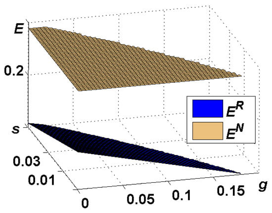 Recall that, as Proposition 3 shows, , meaning that the amounts of disposed used products in Model R are lower than those in Model N; furthermore, in Model R, the OEM engages in remanufacturing under a subsidy policy, further reducing the availability of used cores. Drawing from the data presented in Figure 3, it becomes evident that, since holds true, we can then conclude that Model R is a better choice for the environment than Model N; moreover, Figure 3 illustrates that, as subsidy levels, , increase, the environmental burdens in Model N remain unchanged; however, the environmental burdens in Model R decrease. Thus, subsidy policies for remanufacturing enhance the difference between and .