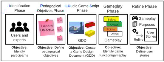 26]. It incorporates a comprehensive verification phase where requirements are rigorously reviewed with the input of various experts. The methodology’s flexibility allows it to be integrated with other agile methods, making it an ideal choice for projects requiring creativity and precision. The design process follows a series of carefully organized steps across five interrelated phases: requirement identification, pedagogical objectives, game script, gameplay, and refinement. Each phase is crucial for ensuring that the final product aligns with both users’ needs and educational objectives, culminating in a communication board that is both functional and user-friendly [