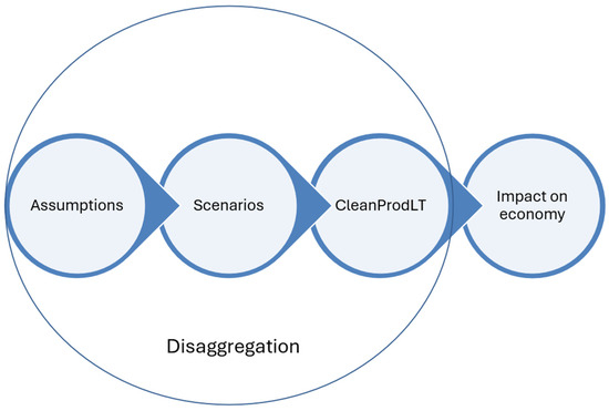 This paper analyses building renovation support practices and their profound economic ramifications. It employs a specialised modelling framework, with the CleanProdLT general economic equilibrium model taking centre stage for modelling and data disaggregation (Figure 1). We are using the general equilibrium model as it offers a more comprehensive framework for analysing the impact on the economic systems compared to partial equilibrium or input–output models. While input–output (IO) models are useful for examining sectoral linkages and static interdependencies, they often fail to capture the feedback effects. Partial equilibrium models, on the other hand, focus narrowly on specific markets, ignoring broader system-wide interactions.