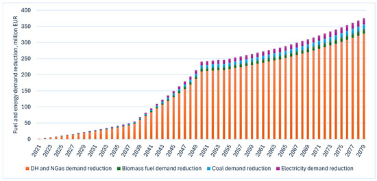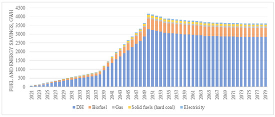 In detail, it is assumed that the multi-apartment buildings of energy class <= D to energy class C will be renovated from 2021 to 2050. This includes a total of 31,140 multi-apartment buildings, the total area of which is 42.24 million m2, from which the small-size multi-apartment buildings (of less than 1000 m2) account for 16%, the medium-size buildings (of 1000–5000 m2) for 64%, and the large-size buildings (of more than 5000 m2) for 21%. The worst multi-apartment buildings are renovated first, taking into account the criteria of fuel and energy savings. From 2021 to 2038, the small-size buildings are renovated, as they have the largest primary fuel and energy-saving potential (143 kWh/m2 a year), followed by the medium-size buildings by 2049 and the large-size buildings by 2050. The Order on Financing Rules for Multi-Apartment Building Renovation [29] explains estimates of fuel and energy savings. It says that minimum mandatory building energy efficiency requirements are applied for multi-apartment buildings. In detail, after renovation, it is mandatory to achieve a building energy efficiency class of at least C and to reduce heat energy consumption by at least 40% compared to consumption before the implementation of the renovation project. To achieve these savings, energy-efficiency-enhancing measures such as ventilation and recuperation system reorganisation, roof and external wall insulation, heating and hot water systems reorganisation or replacement, glazing or replacement of windows in balconies, common rooms, elevator renovation, etc., should be implemented [30]. In previous research [31], we assumed that the validity period of energy efficiency measures enabling fixed energy savings is 30 years, after which energy performance of the multi-apartment building achieves its primarily poor status; therefore, energy savings are no longer modelled, and the impact estimates end in 2079. In this research, we refer to the latest studies [32,33,34] demonstrating that energy performance drops in the buildings over a long period due to aging and degradation of various building components. Energy consumption is shown to increase by 10% to 40% over 20 years. Based on the scientific literature findings, we consider that the primary energy consumption (kWh/m2) in the renovated multi-apartment buildings increases by 12% each year after 5 years from the renovation, by 13% each year after 10 years, by 16% each year after 15 years, by 17% each year after 20 years, and by 18% each year after that until 2079, resulting in a reduction in total energy savings. An assumption is taken that energy and fuel savings will have the structure of the energy and fuel mix for 2019. Specifically, DH savings will account for 79%, biofuel—14%, gas–2%, hard coal–3%, and electricity–2% of total energy savings [35]. Figure 3 presents changes in total energy savings in Lithuanian multi-apartment buildings.
