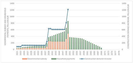 As shown in Figure 4, the need for construction services is staggered. As long as small-size multi-apartment buildings are being renovated, the demand for construction is relatively small (on average, EUR 127 million each year). After renovating medium-sized multi-apartment buildings, payments to the construction sector increased five-fold to EUR 633 million per year. Finally, the renovation of large-size multi-apartment buildings requires the most investment. EUR 1216 million will be paid to the construction sector in 2050. To accelerate the renovation processes and support investment decisions, the Government allocates a subsidy annually until 2050. Households receive soft loans. Soft loans for renovating large buildings in 2050 will be fully repaid in 2069.