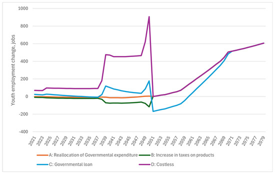 Modelled changes in youth employment from 2021 to 2079 (calculated by authors).