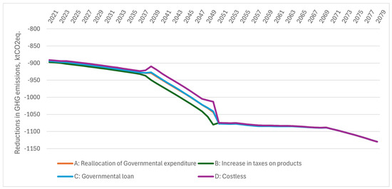 As shown in Figure 9, reductions in GHG emissions increase over the period from 900 ktCO2eq. in 2021 to 1130 ktCO2eq. in 2079. Overall, there are no significant differences in GHG emission reductions between scenarios. However, more obvious distinctions in GHG emissions development occur when medium- and large-size multi-apartment buildings are renovated from 2039 to 2050. During this period, the most favourable option is to increase taxes on products, as it allows for the reduction in GHG emissions from 949 ktCO2eq. in 2039 to 1080 ktCO2eq. in 2050. If the implementation of energy efficiency measures in multi-apartment buildings is financed with non-refundable money from the foreign sector, the impact on reduction in GHG emissions is the smallest, i.e., from 910 ktCO2eq. in 2021 to 1013 ktCO2eq. in 2021, as the results of the Costless scenario demonstrate, and if energy efficiency measures are financed by relocating the Governmental expenditure or by receiving the Governmental loan, the reductions in GHG emissions are found in between ones achieved by the Increase in Taxes on Products scenario and the Costless scenario, i.e., 929 ktCO2eq. in 2021 and 1043 ktCO2eq. in 2050. In the case of the best scenario, which is the Increase in Taxes on Products scenario, the most significant decreases are estimated in electricity, gas, and steam (1142 ktCO2eq.), land transport services (7.4 ktCO2eq.), and chemicals and chemical products (4.3 ktCO2eq.) industries. The most significant increases in GHG emissions are estimated in the agricultural industry (24.6 ktCO2eq.) and the manufacture of coke and refined petroleum products industry (3.5 ktCO2eq.) in 2079.