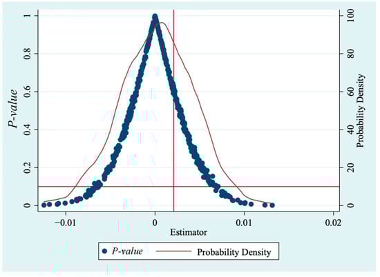To assess the robustness of benchmark regression findings and address potential concerns regarding omitted variable bias, this paper performs a placebo test. Specifically, the core independent variable, the SCPP, is regressed using 500 randomly selected non-repeated samples by employing the DID method. This process generates a two-tailed distribution of the estimated coefficients and significance levels for the dummy random samples, as shown in the figure. As illustrated in Figure 2, the estimates for the placebo samples are normally distributed around zero, whereas the estimated coefficients from the benchmark regression are clearly distinct and fall outside the range of the placebo sample distribution. This suggests that the results of the 500 simulations in the regression model are correct with certainty, indicating that the benchmark regression results pass the placebo test. Moreover, this outcome implies that omitted variable bias does not compromise the validity of the benchmark regression estimates.