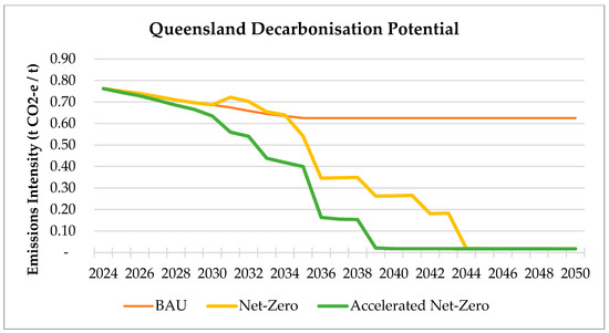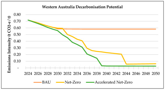 Three scenarios were selected to evaluate the sustainability performance of alumina production in Western Australia and Queensland: Business-as-Usual (BAU), Net-Zero, and Accelerated Net-Zero. These scenarios span a 25-year window (2025 to 2050), aligned with Australia’s national net-zero commitments [103]. Each scenario considers changes in production practises, energy systems, and technology adoption, to provide a forward-looking perspective on decarbonisation potential and sustainability performance.