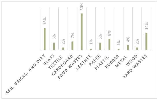 Approximately 37% of MSW is dumped in landfills, whereas 33% of MSW is directed to open sites [8] as part of global waste disposal initiatives. Wu et al. [9] analyzed refurbishment techniques for end-of-life and used goods, concluding that reusing recycled materials delivers superior sustainable benefits. Because there is a shortage of proper disposal facilities in Pakistan [10], open-pit disposal is the preferred approach for managing MSW. Pan et al. [11] evaluated acidogenic fermentation for food waste administration, exposing that CO2 splitting grows acetic acid fabrication by promoting acetate-producing organisms and limiting contending avenues. This waste, which amounts to 0.79 kg per person per day, negatively affects the globe’s climate, health, and biodiversity. The study provides solutions tailored to specific countries, identifies significant issues, and presents feasible solutions to promote worldwide progress in sustainability in both the economy and the environment [12]. Sohoo et al. [13] performed an exhaustive study of the open disposal method for MSW in Pakistan, particularly in Karachi. Aslam et al. [14] examined the performance of the solid waste disposal system in Karachi, using materials flow analysis to explore the transit of solid waste. Iqbal et al. [15] explored global challenges with managing municipal waste, focusing on middle-income and low-income countries like Pakistan. The growing production of MSW in Asian metropolitan areas, combined with insufficient waste disposal systems and energy limitations [16], raise serious threats to people’s health and the surroundings. Figure 1 shows the composition of MSW generated in Pakistan.