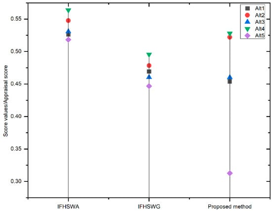 The AOs in ref. [45] are insufficient for properly evaluating facts built into more secure categories that possess the exactitude required to produce precise outcomes. Let be two experts with weights and let be the parameters with their sub-parameters, such as and , where with weights . Let be an alternate, and then experts’ evaluation of the planned aspects in terms of IFHSNs. The obtained aggregated value using the IFHSWA [45] operator is . The validity of these AOs is unreliable, and only basic knowledge about the alternatives can be found. Thus, merging IFHSNs into the composition of interaction AOs offers an exciting and important way to investigate. The techniques described in [45] are inadequate for carefully examining information while observing previous theoretical structures and presenting obvious, practical implications.
