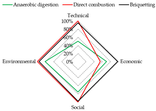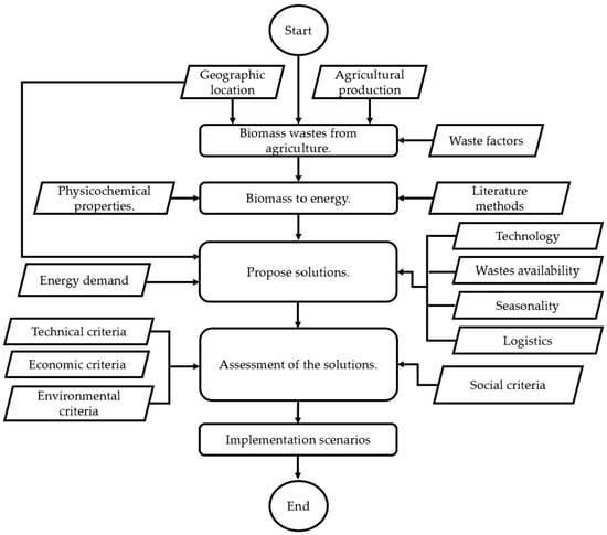 Thermochemical technologies (e.g., packed bed, fluidized bed, pulverized fuel systems) are suitable for biomass sources under 50% moisture, while bioconversion technologies are more indicated for biomass sources over 50% moisture [56]. Therefore, this study considers direct combustion and anaerobic digestion for the energy valorization of agricultural wastes.